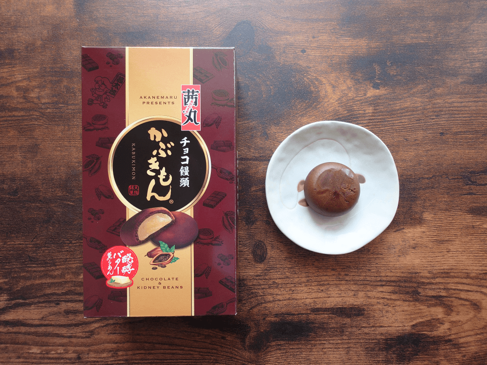 姉妹品の「チョコ饅頭かぶきもん」は、ミルク餡を濃厚チョコ風味の生地で包んだもの