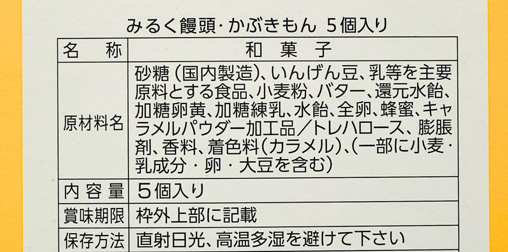 「みるく饅頭かぶきもん」5個入りの体裁はこんな感じ