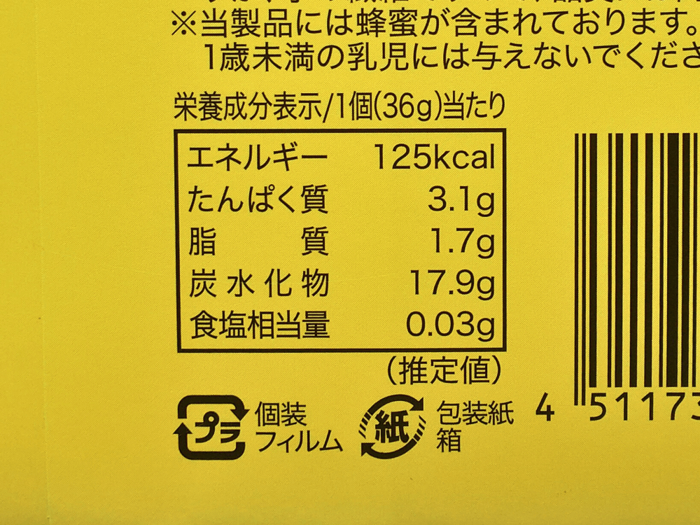 原材料名、栄養成分表示、賞味期限は、外側の包装紙のみの記載で、個包装にはついていません