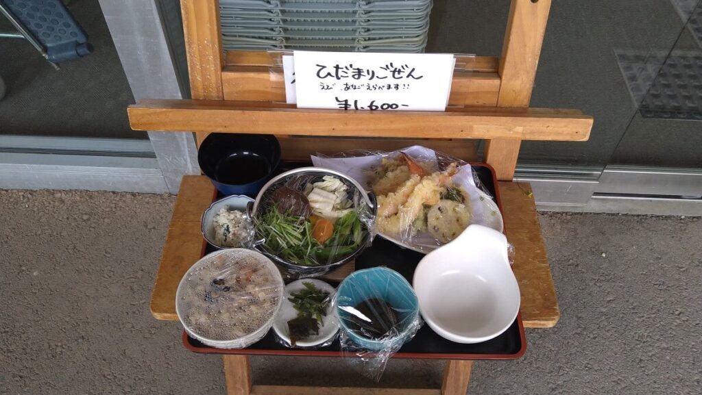 こちらは道の駅内のレストラン「ひだまり」の「ひだまりごぜん」。てんぷらと小鍋(湯豆腐)がついてなかなかのボリュームです。